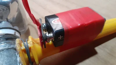 Unimos la batería al mango del cautin utilizando cinta aislante y soldamos el conector de la batería (broche) a los cables del ventilador, respetando polaridades.